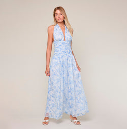 This elegant halter maxi dress features a sophisticated blue floral print complemented by a flattering V-neckline. Structured boning adds shape and support, while delicate ruffle details bring graceful movement and refinement. Perfect for formal occasions or stylish summer evenings, this dress combines timeless charm with modern design for a stunning, confident look.