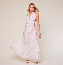 Elevate your wardrobe with this elegant halter maxi dress, featuring a delicate pink floral print and a flattering V-neckline. Designed with structured boning for a refined silhouette and detailed ruffles that add graceful movement, this dress embodies timeless sophistication. Perfect for special occasions, it blends feminine charm with subtle architectural accents for a look that captivates.