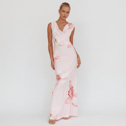 Elevate your evening wardrobe with this sophisticated maxi dress, featuring a delicate pink floral print on luxurious satin fabric. The flattering V-neckline and cascading ruffles create an effortlessly graceful silhouette, while the floor-length cut offers timeless elegance. Perfect for special occasions, garden parties, or upscale gatherings, this piece combines refined femininity with modern style. A versatile investment that transitions beautifully from day events to evening affairs.