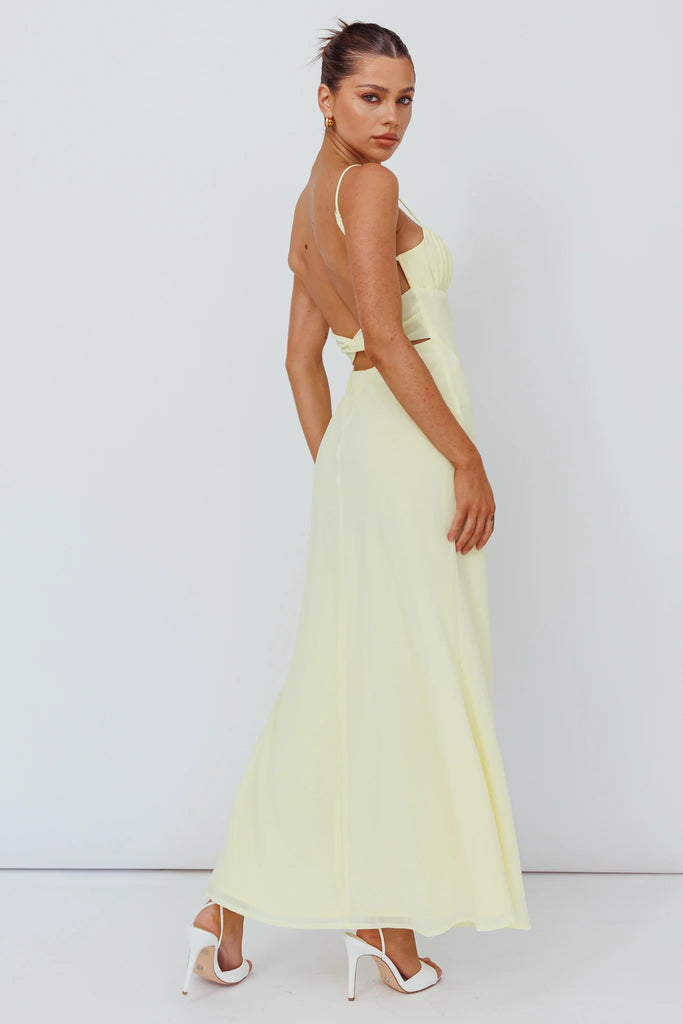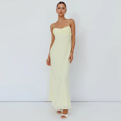 Elevate your evening wardrobe with this sophisticated maxi dress, featuring a striking open back design and intricate twist detailing. The vibrant lemon hue brings a fresh, modern edge to classic elegance, while delicate straps provide refined support. Perfect for upscale events, cocktail parties, or memorable nights out, this piece combines contemporary flair with timeless sophistication. The flowing silhouette flatters all figures, making it an essential addition to any refined collection.