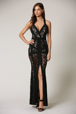 Elegant Black Nude Floral Lace V-Neck Maxi Dress with Middle Slit