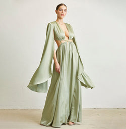 Elegant Light Green Satin Deep V-Neck Cut-Out Crystal Detailed Open Back Maxi Dress with Cape Sleeve