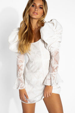 Fashion White Lace Puffy Ruffle Shoulder Dress with Bell Sleeve