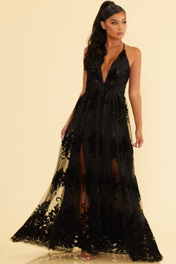 Elegant Black Floral Lace Strap Deep V-Neck Gown