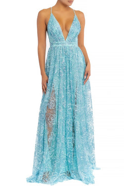 Elegant Light Blue Multi-Color Floral Sequence Glitter Strap Deep V-Neck Gown Dress