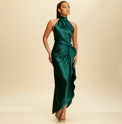 Indulge in luxury with our Elegant Mock Neck Hunter Green Satin Wrap Tie-Up Open Back Maxi Dress. Crafted with a sophisticated mock neck, satin fabric, and a stunning open back design, this dress exudes elegance and exclusivity. The wrap tie-up adds a touch of artistry, making you stand out in any event.