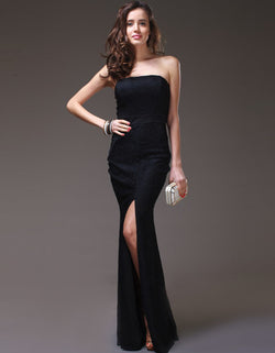 Strapless Black Lace Gown with Middle Slit