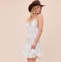 Elegant Summer Strap White Floral Lace Detailed Beige Floral Print V-Neck Open Back Ruffle Mini Dress