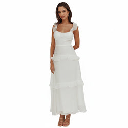 Elegant White Band Detailed Ruffle Back Tie-Up Maxi Dress