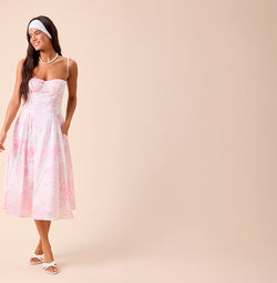 This elegant summer midi dress features a delicate white and pink print, complemented by a flattering V-neckline and a structured corset design that enhances your silhouette. The ruffled details add a touch of femininity and movement, making it perfect for warm-weather occasions where style and comfort meet effortlessly.