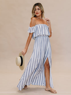 Fashion Summer Off Shoulder Navy Marine Ruffle Cut Out Maxi Dress