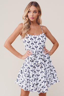 Fashion Summer Strap White Blue Leaf Print Ruffle Tie-Up Dress