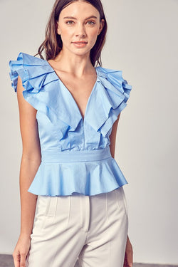 Elegant Chambray Ruffle V-Neck Peplum Top
