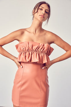 Elegant Strapless Faux Leather Dry Rose Ruffle Back Tie-Up Dress