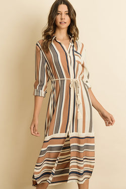 Elegant Beige Midi Striped Multi-Color Shirt Dress