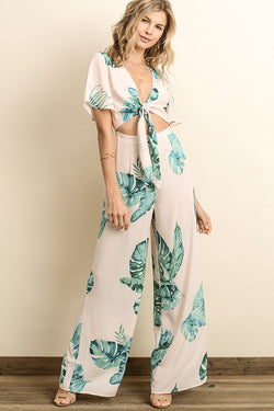 Elegant Front Tie-Up Cut Out Tropical Print Blush Jumpsuit
