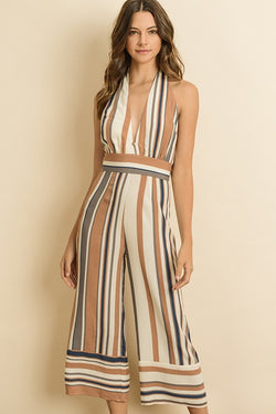 Fashion Beige Stripe Halter Cropped Jumpsuit
