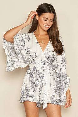 Fashion White Navy Floral Print Ruffle Tie-Up Romper