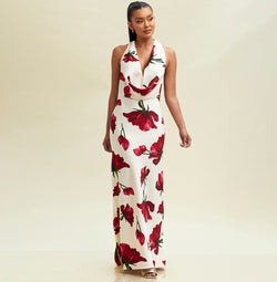 Elegant Halter Ivory Satin Red Floral Print Ruffle V-Neck Maxi Dress