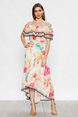 Elegant Off Shoulder Off White Ruffle Multi-Color Floral Print High Low Dress