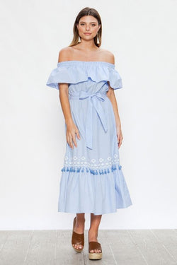 Fashion Summer Off Shoulder Light Blue Tie-Up Ruffle Tassel Maxi Dress