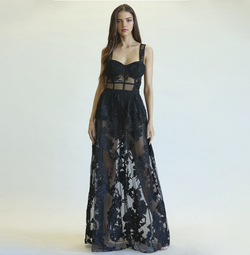 Elegant Black Couture Strap Corset Floral Embroidery Gown