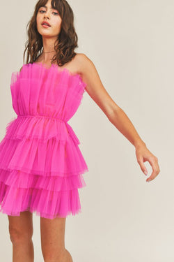 Elegant Hot Pink Strapless Ruffle Tulle Mini Dress