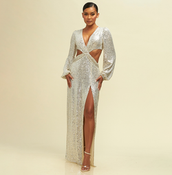 Elegant Nude Silver Sequence V-Neck Cut-Out Open Back Maxi Dress with Long Sleeve