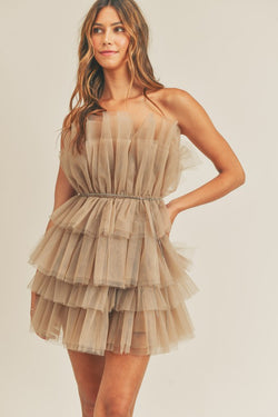 Elegant Taupe Strapless Ruffle Tulle Mini Dress