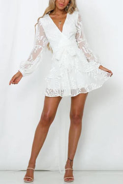 Elegant White Embroidery Ruffle Tie-Up Dress with Bell Sleeve