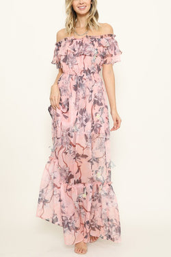 Fashion Off Shoulder Pink Butterfly Detailed Maxi Dress