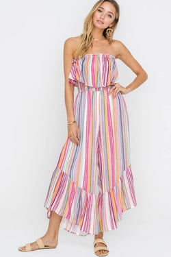 Fashion Pink Multi-Color Stripe Strapless Ruffle Jumpsuit