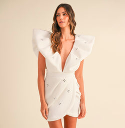 Elegant Off White V-Neck Rhinestone Detailed High Low Puffy Ruffle Mini Dress