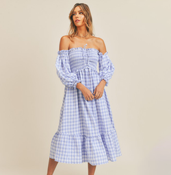 Fashion Off Shoulder Blue Checkered Ruffle Elastic Midi Dress with Bell Sleeve