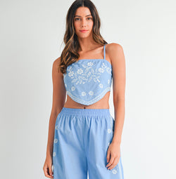 Elevate your summer wardrobe with this exquisite periwinkle crop top. Delicate white floral embroidery adorns the fabric, while the elegant back tie-up detail offers both adjustable comfort and refined style. The slender straps and cropped silhouette create a sophisticated profile perfect for warm-weather soirées or upscale casual gatherings.