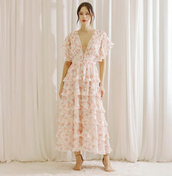 Elegant Pink Orange Floral Print V-Neck Back Tie-Up Layered Ruffle Midi Dress