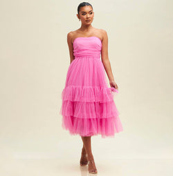 Elegant Strapless Pink Layered Ruffle Midi Dress