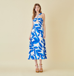 This unique one-shoulder midi dress presents a luxurious blend of fashion and femininity. Crafted from a lightweight and sheer fabric, its delicate blue floral print flutters exquisitely as you move. The cut-out back and waist-cinching tie-up add a touch of contemporary charm, making this the perfect dress for any special occasion.