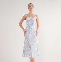 Fashion Strapless Blue Floral Print Corset Midi Dress
