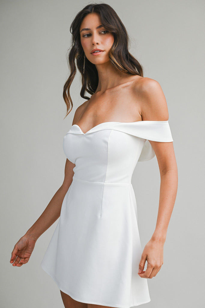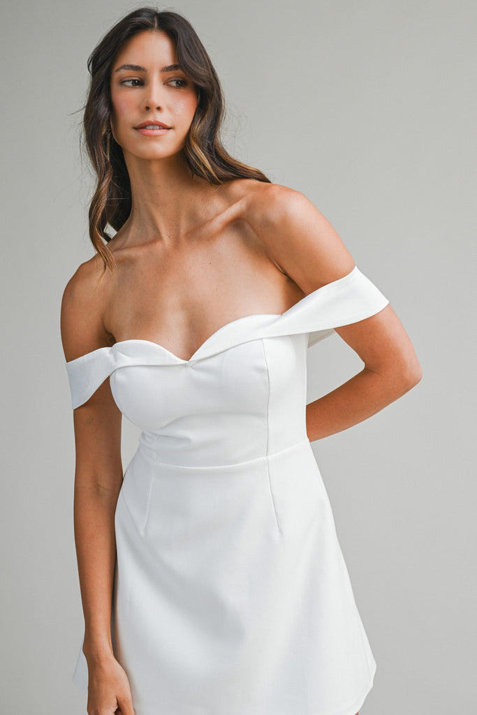 Elevate your evening look with this sophisticated off-shoulder mini dress, where refined tailoring meets contemporary elegance. The off-white palette provides a timeless canvas, while tuxedo-inspired detailing adds a polished, upscale edge. A structured corset bodice creates a flattering silhouette, complemented by delicate ruffles that introduce movement and dimension. Perfect for cocktail events, upscale dinners, or any occasion demanding understated glamour, this piece seamlessly transitions from day to night with effortless style.