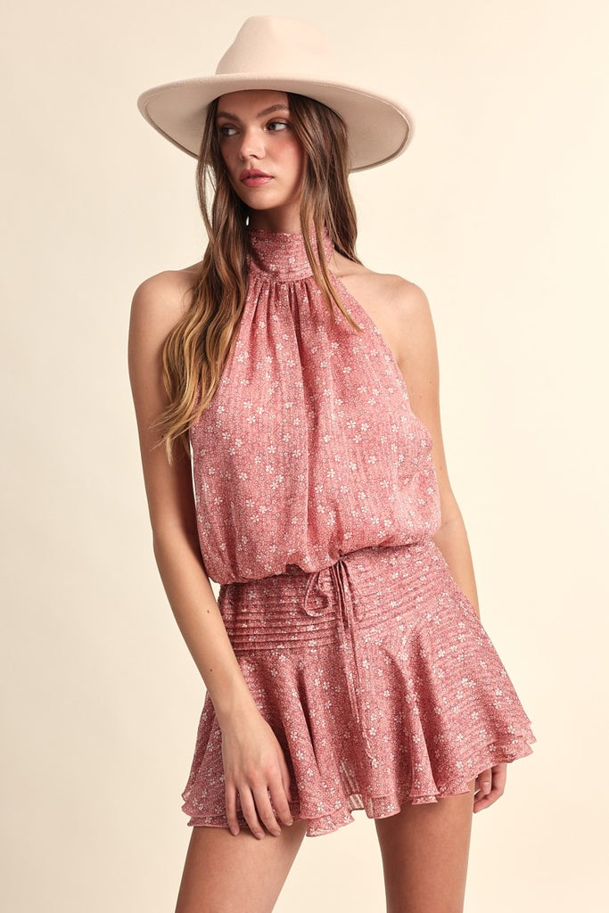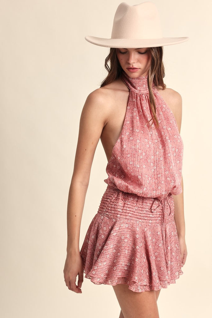 Discover understated luxury in this halter mini dress, where romantic floral meet contemporary tailoring. The pink floral print provides a soft, feminine foundation while the adjustable tie-up back detail offers both comfort and visual intrigue. Graceful ruffles frame the hemline with subtle dimension, and the halter neckline ensures a flattering, secure fit. Ideal for elevated casual occasions, intimate gatherings, or stylish daytime events, this dress embodies refined elegance with an effortlessly chic appeal.