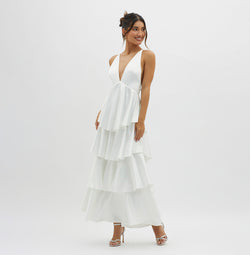 Elegant Strap Ivory Satin Deep V-Neck Layered Ruffle Open Back Maxi Dress
