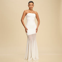 Elegant White Strapless Ruffle Jersey Mesh Maxi Dress