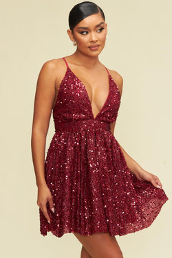 Elegant Wine Sequence Strap V-Neck Ruffle Dress