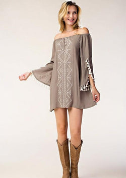Casual Off Shoulder Mocha Dress with Embroidery Tassel Detailed