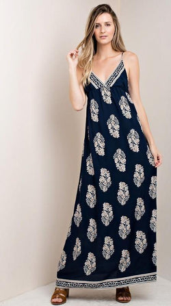 Casual Strap Navy Maxi Dress with Mocha Print