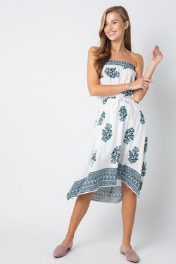 Casual Strapless White Dress Tie-Up with Blue Floral Print