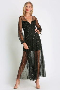 Elegant Black Crystal Gold Stars Detailed Dress with Sheer Sleeves