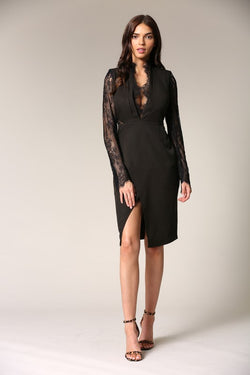 Elegant Black Lace Deep V-Neck Cut-Out Dress with Detailed Sleeve