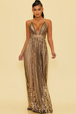 Elegant Black Nude Gold Sequence Glitter Baroque Strap Deep V-Neck Gown Dress